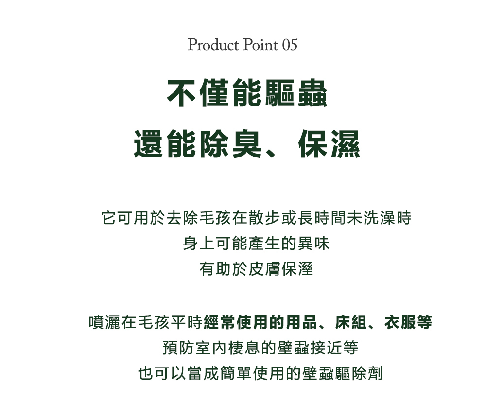 - 驅離壁蝨 、預防蚊蟲跳蚤、兼用除臭 -
