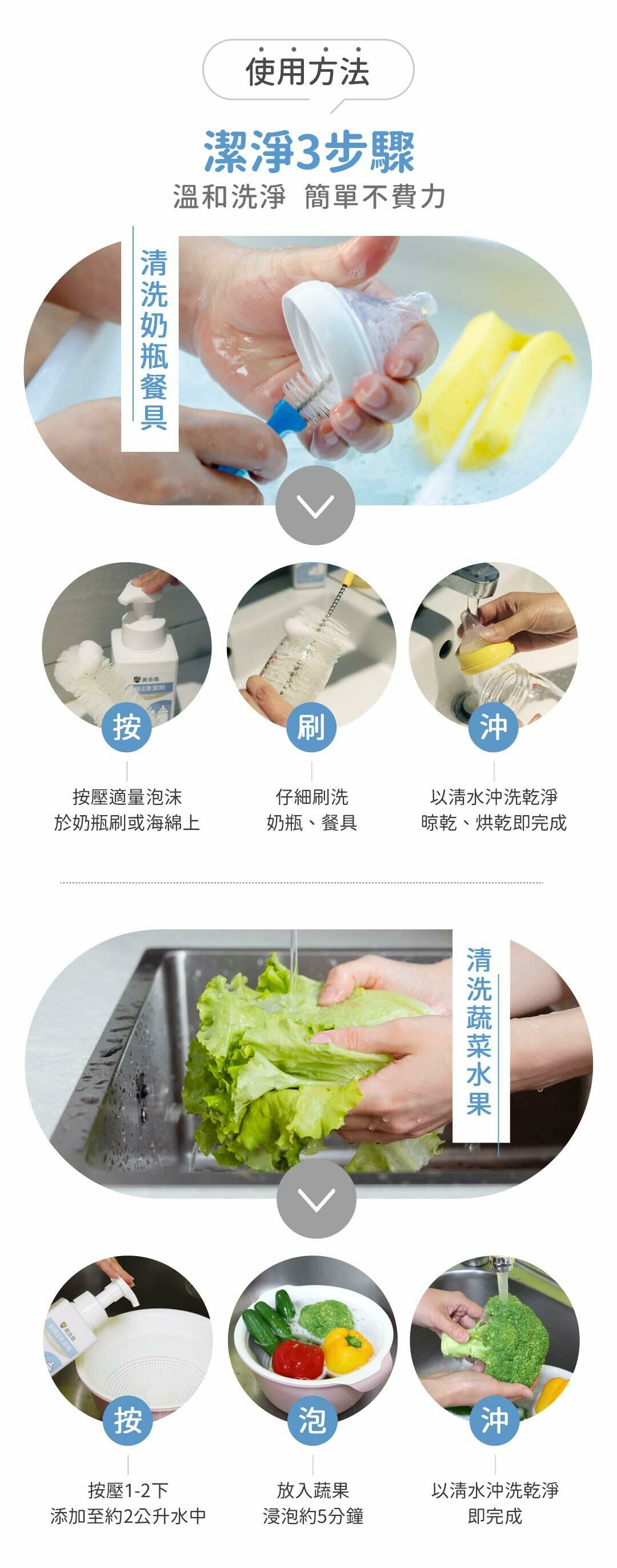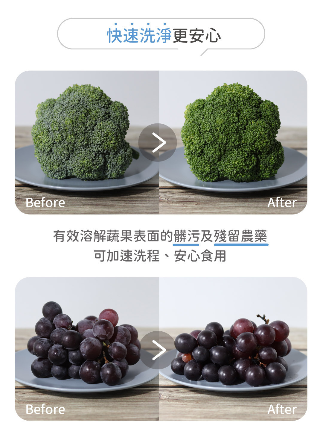 ⊙清洗蔬果:按壓1-2下,添加至2公升水中,將蔬果浸泡5分鐘後以清水洗淨。