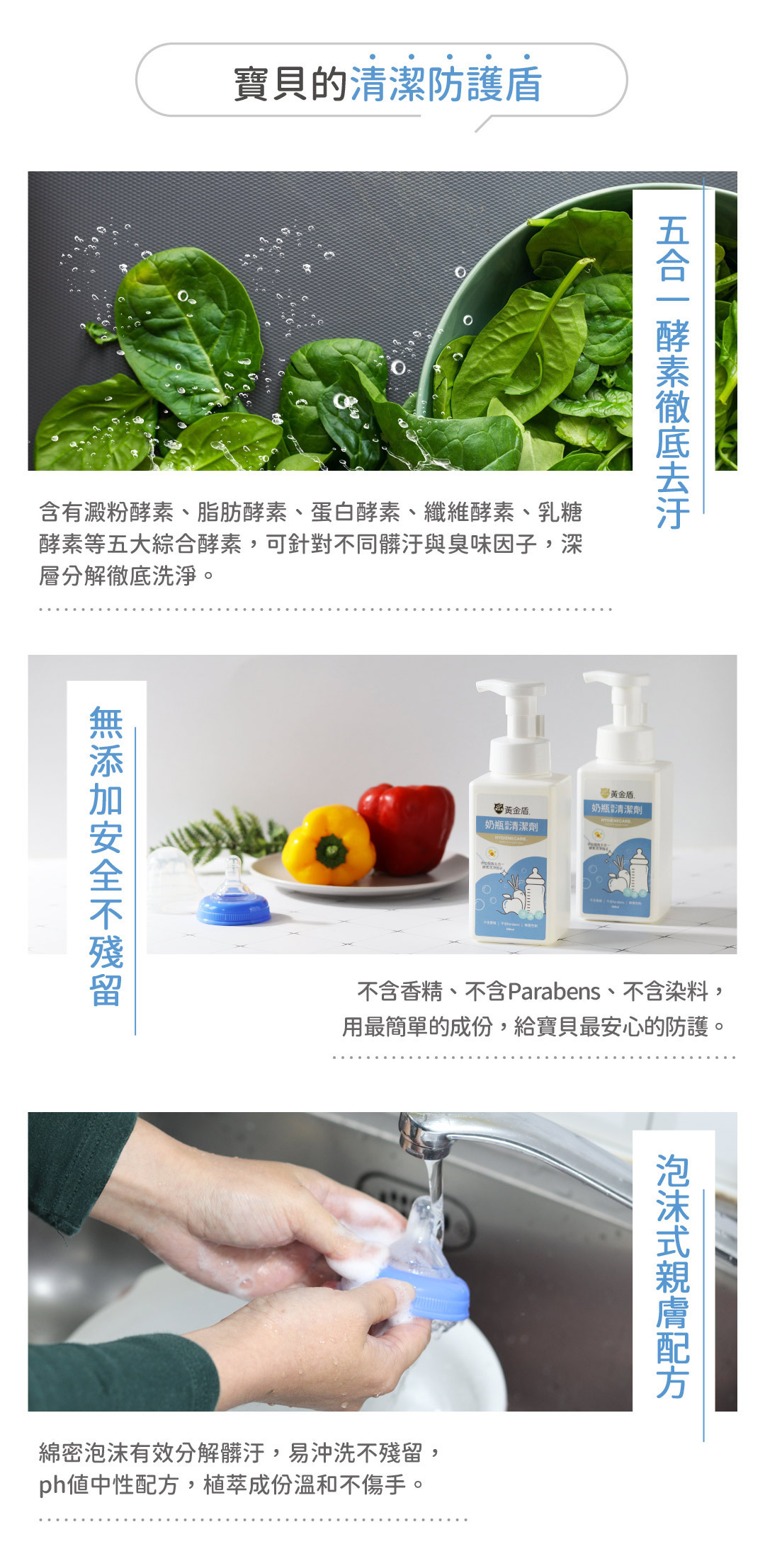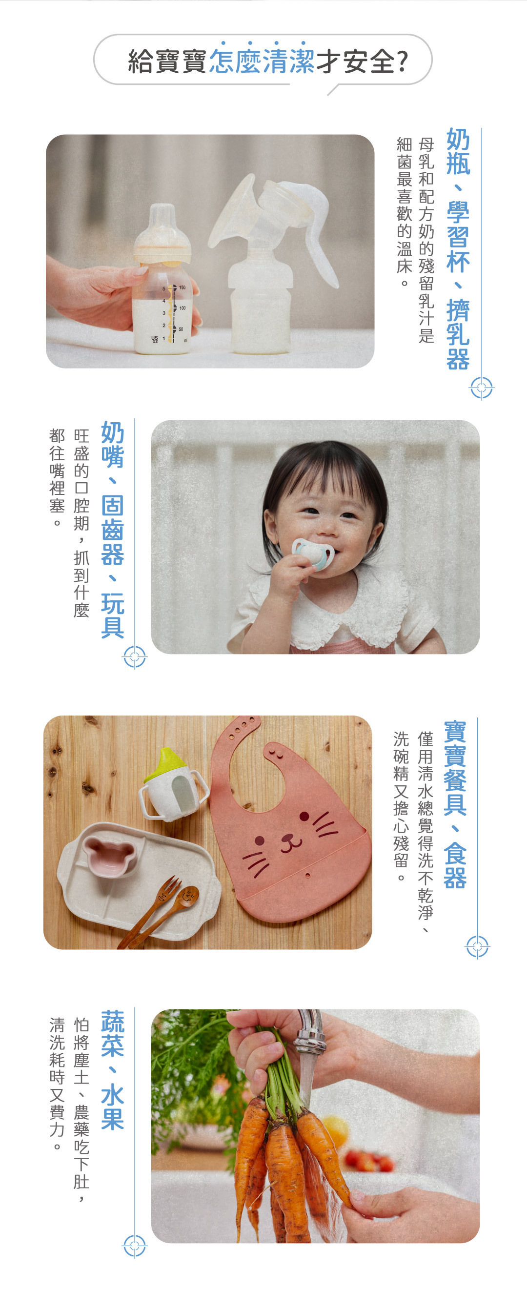 ⊙清洗奶瓶餐具:按壓適量泡沫於奶瓶刷或海棉上,將餐具清洗乾淨即可。