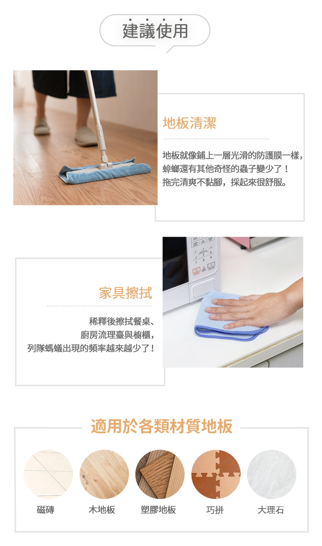 ►用途:擦拖清潔各類材質,磁磚、木地板、塑膠地板、巧拼等皆可使用,也可用於擦拭家具或噴灑家中角落。