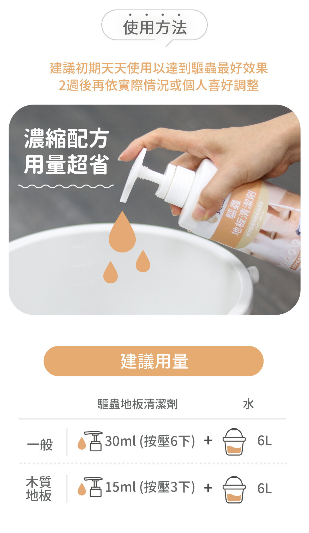►使用方法:請按比例1:200稀釋使用(木質地板建議比例1:400),可用於拖地清潔或擦拭物品傢俱。