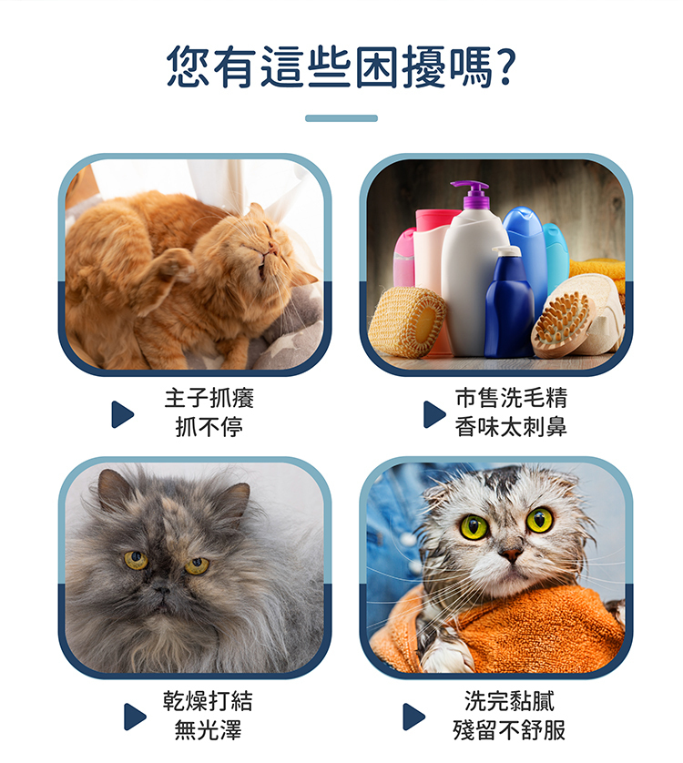►用途:專為貓咪細緻肌膚設計的舒敏保濕配方,全貓種適用。