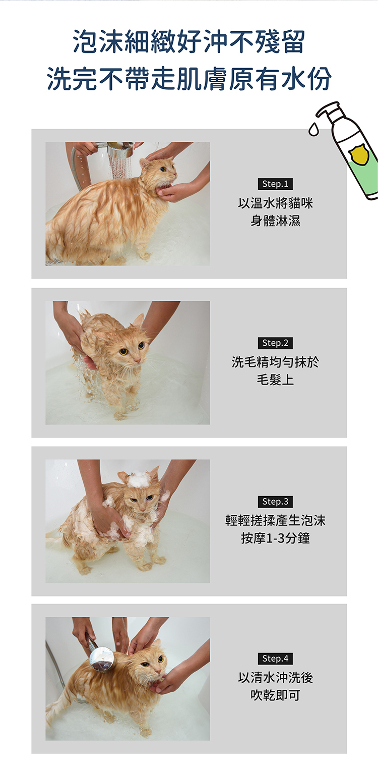 ►使用方法:以溫水將貓咪身體淋濕後,洗毛精均勻抺於毛髮上,輕輕搓揉產生泡沬,按摩1-3分鐘後,再用溫水徹底沖洗乾淨。